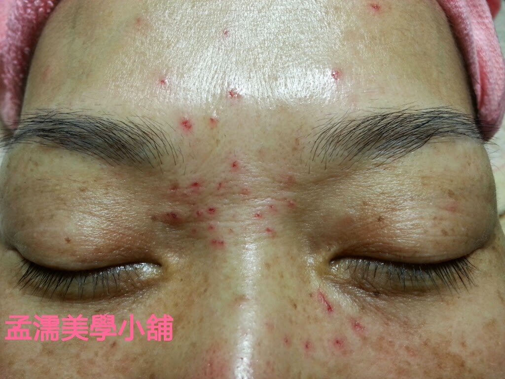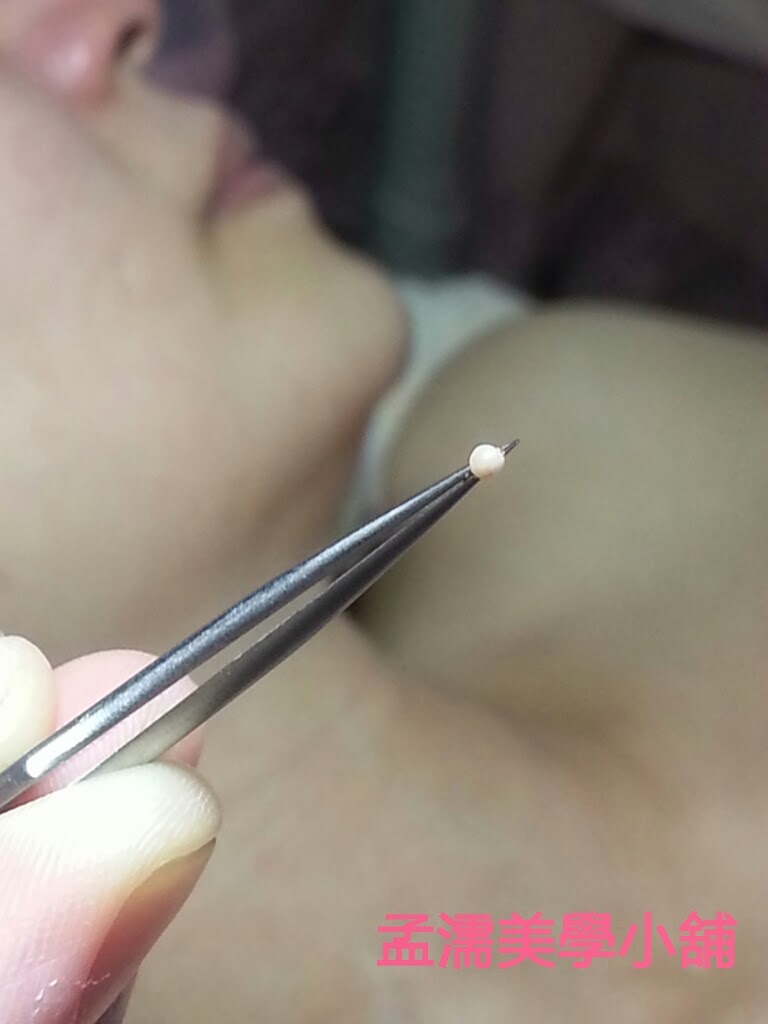 脂肪球是因皮膚乾燥使油質異常分泌而在表皮形成球狀!如圖1.眉頭中間有一顆顆看起來像白頭粉刺,但卻沒有毛囊出口的這就是所謂的【脂肪球】